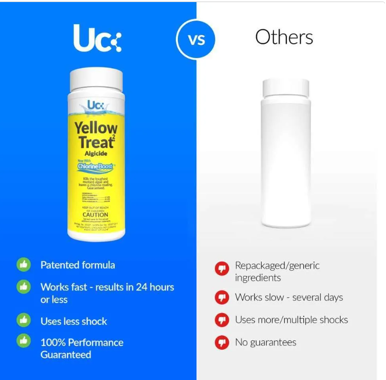 Yellow Treat®² makes killing mustard algae fast and easy. Just add 5 ounces per 10,000 gallons, brush, and shock. Then wake up the next day to an algae-free pool that still has a chlorine reading. Yellow Treat®² contains ChlorineBoost™, the patented formula of ingredients that supercharges its algae killing ability while stabilizing chlorine readings. Always add Yellow Treat®² directly to the pool or spa.